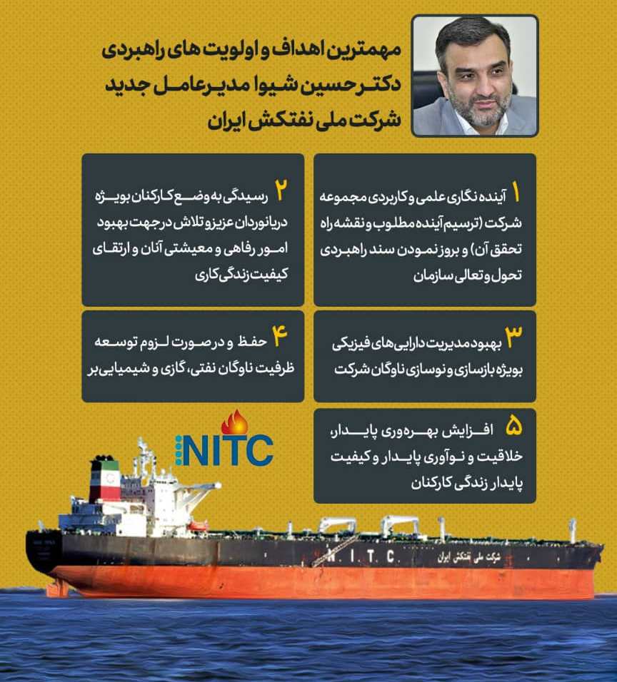 اهواز/ حبیب خبر- کورش محمد حسینی: مهم ترین اهداف و اولویت های راهبردی دکتر حسین شیوا مدیرعامل جدید شرکت ملی نفتکش ایران را در تصویر بالا مشاهده کردید.
