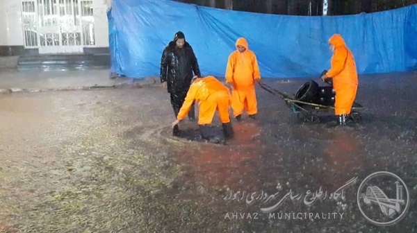 تلاش نیروهای شهرداری منطقه یک اهواز برای رفع آبگرفتگی معابر