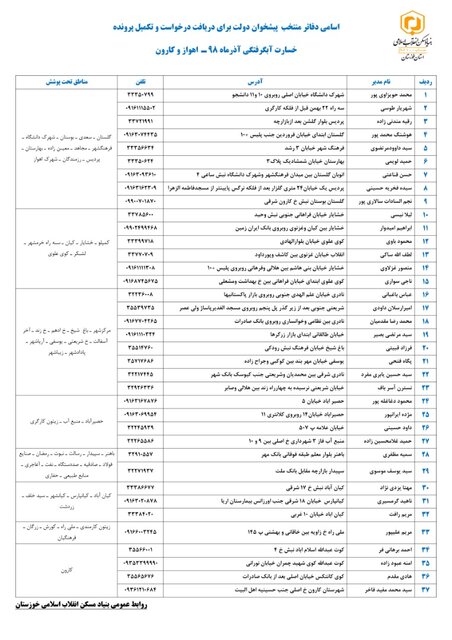 دفاتر منتخب پیشخوان دولت برای ثبت درخواست و تکمیل پرونده خسارت آبگرفتگی اهواز و کارون به شرح زیر است: