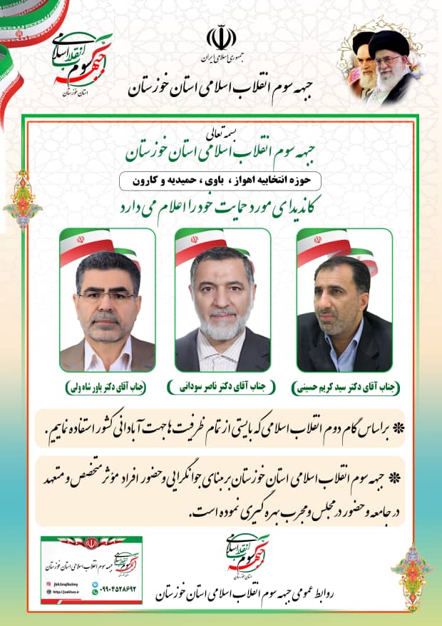 امید است این سه نفر که سوابق، تحصیلات، تجربه و تخصص آنان در معرض افکار عمومی نهاده شده است؛ بتوانند با اعتماد شما افتخار نمایندگی مردم اهواز، باوی، حمیدیه و کارون را در مجلس شورای اسلامی پیدا کنند و با تصویب قوانین دقیق و درست و نظارت لازم بر اجرای آنها، انتظارات مردم حوزه انتخابیه اهواز ، باوی، حمیدیه و کارون را برآورده سازند و به ویژه برای حل مشکل های معیشتی و اقتصادی گام های مؤثری بردارند."#دکتر ناصر سودانی #دکتر سید کریم حسینی # دکتر یاور شاه ولی #