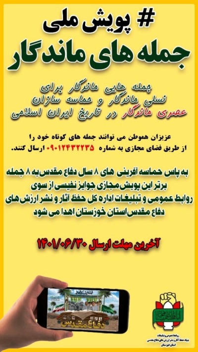 وی توضیح داد: یکی از برنامه های شاخص هفته دفاع مقدس خوزستان که در بستر رسانه به ویژه فضای مجازی منتشر می شود، پویشی است که از هموطنان عزیز از جمله جوانان خواسته ایم یک جمله ادبی ماندگار درباره فرهنگ ناب دفاع مقدس نوشته و از طریق نرم افزارهای مجازی به دبیرخانه پویش ارسال کنند.