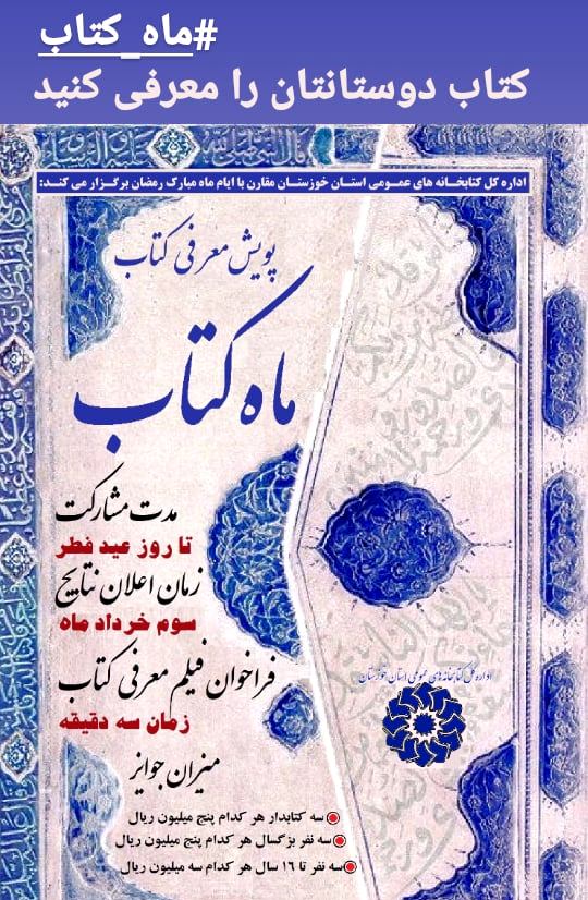 همزمان با ماه مبارک رمضان ادارهکل کتابخانههای عمومی خوزستان، پویش معرفی کتاب با عنوان «ماه کتاب» را در سطح استان برگزار میکند.
