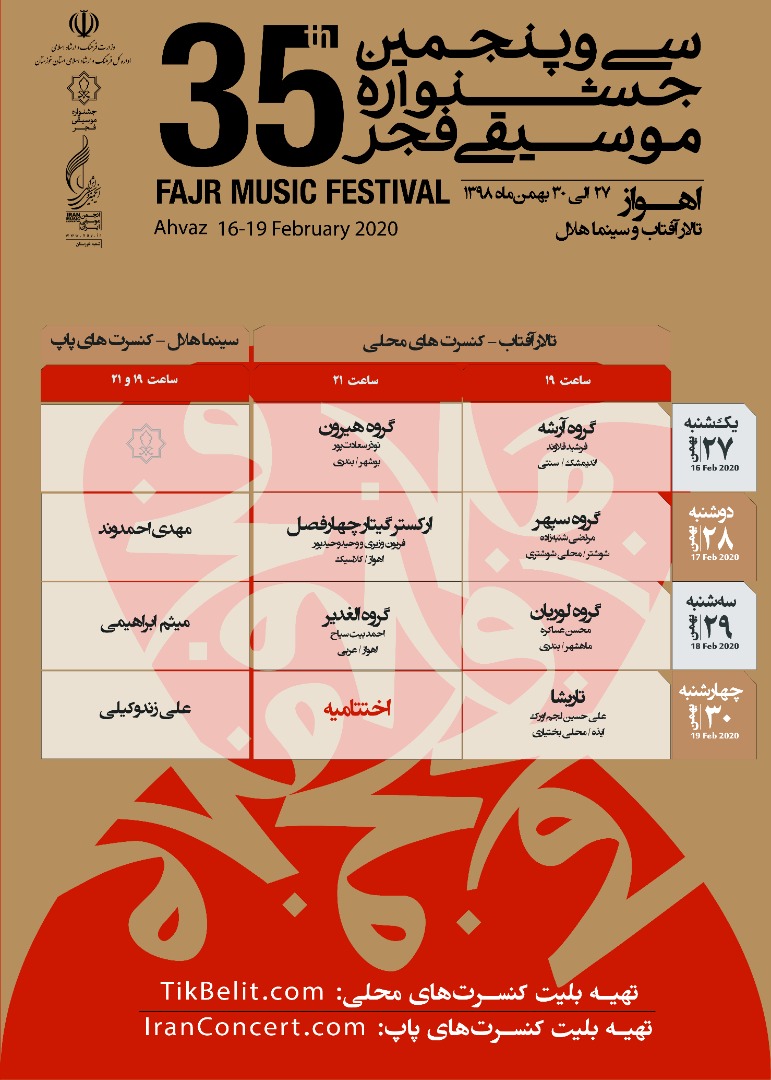 معاون هنری اداره کل فرهنگ و ارشاد اسلامی خوزستان توضيح داد: گروه «تاریشا» به سرپرستی علی حسین نجم اورک از ایذه، «آرشه» به سرپرستی فرشید قلاوند از اندیمشک، ارکستر گیتار کلاسیک«چهار فصل» به سرپرستی فریدون وزیری و وحید وحیدپور از اهواز ، گروه «لوریان» به سرپرستی محسن عساکره از ماهشهر، گروه «هیرون» به سرپرستی نوذر سعادت پور از بوشهر ، گروه «سپهر» به سرپرستی مرتضی شنبه زاده از شوشتر و گروه «الغدیر» به سرپرستی احمد بیت سیاح از اهواز در تالار آفتاب اهواز از ۲۷ تا ۳۰ بهمن روی صحنه میروند.
