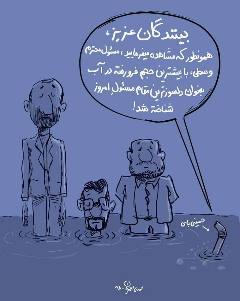 حضور مسئولان و چهره های مختلف در کنار سیل زدگان و گزارش های حسینی بای از منطقه با واکنش های متفاوت مردم در شبکه های اجتماعی مواجه شد که همین موضوع، سوژه کارتونی از مهدی احمدیان با عنوان «مسئولان فرو رفته در آب» در کانال خبر فوری ایران شد.